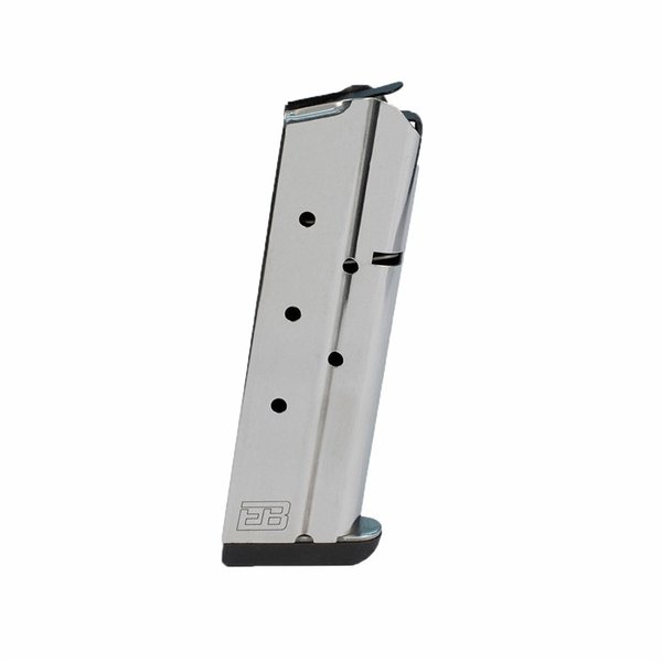 For many years, the 1911 Government Model has been available in chamberings for cartridges other than its original .45 ACP, including .38 Super, 9mm Luger, and the potent 10mm Auto. The folks at the Ed Brown shop figure that just because your 1911 is chambered in one of these alternate cartridges shouldn't mean you have to sacrifice magazine reliability. Like Ed Brown's .45 magazines, their alternate caliber 1911 mags have a virtually seamless body of heat-treated stainless steel, with a self-levelling STEEL - not plastic! - follower supported by a heavy duty spring with plenty of oomph to keep the round stack moving. These 1911 Government Model magazines have a welded-on steel baseplate to minimize bulk for situations where you want to keep thing compact. Each mag comes with a pair of screw-on rubber base pads - a thin pad to protect that mag when ejecting it on hard ground, and a thick pad to provide extra length to aid insertion into and removal from a pistol with an extended magwell. These mags can go from competition to concealed carry simply by swapping the base pads. Models for pistols chambered in .38 Super, 9mm Luger, and 10mm Auto 9-Rd capacity Sturdy 410 stainless steel body / welded-on base plate Available with natural Silver finish or Black Nitride Witness holes for easy monitoring of load status The Ed Brown shop's unique hydro-finish process gives the mag body and follower an extra-slick surface that repels dirt, dust, and burned powder to eliminate unnecessary friction against the follower to ensure consistent feeding and easy seating in the magwell. You can get these 1911 Government Model magazines with a natural Silver finish or a non-reflective Black Nitride finish for extra protection from and corrosion. If you're looking for a premium-quality magazine engineered and manufactured to the highest standards to deliver outstanding reliability and smoothness from your "other caliber" 1911 Government model… you've found it!