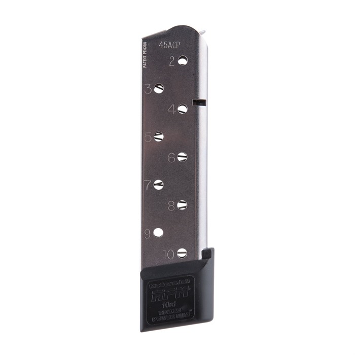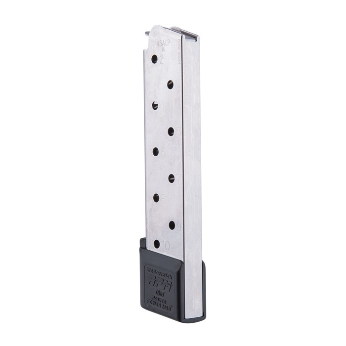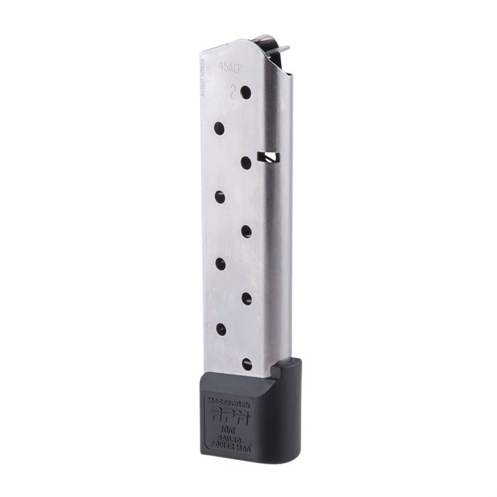 New Feed Lip Configuration For Ultra-Smooth, Extremely Reliable Feeding The Chip McCormick .45 ACP Railed Power Mag has unique dual-wall "feed rails" that are twice as strong as standard feed lips to prevent jams caused by bent, warped, or damaged lips. The rails provide an extremely smooth surface that further encourages smooth feeding. The key is putting extra metal on the feed lip area, then rolling it inward for a huge increase in overall rigidity of this area. The Chip McCormick .45 ACP Railed Power Mag also has a mag body of corrosion-resistant stainless steel with laser welded seams so there are no snags when inserting or dropping the mag from the magwell. The spring is McCormick's proprietary high tensile strength Rocket Wire with plenty of energy to keep even a full round stack moving. 10-Round capacity Stainless steel mag tube Black polymer base pad is beveled to accommodate mag wells Witness holes The Chip McCormick .45 ACP Railed Power Mag have been independently tested and proven to have twice the service life of ordinary 1911 mags.