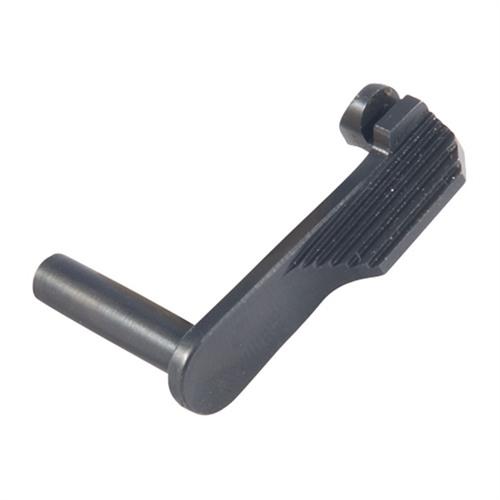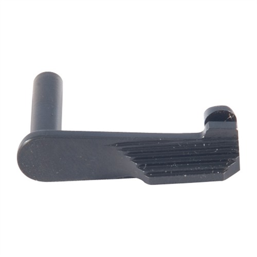 Redesigned slide stop is machined from bar stock for strength and contoured for easy, reliable, positive operation. Features a long, wide finger pad with aggressive serrations for excellent traction, and a .200" diameter pin for secure lockup and smooth operation. The engagement surfaces contacting the magazine follower and the slide notch have been modified and optimized for performance, while the rear face is angled so the detent plunger keeps it positively in place under recoil until the magazine is empty.