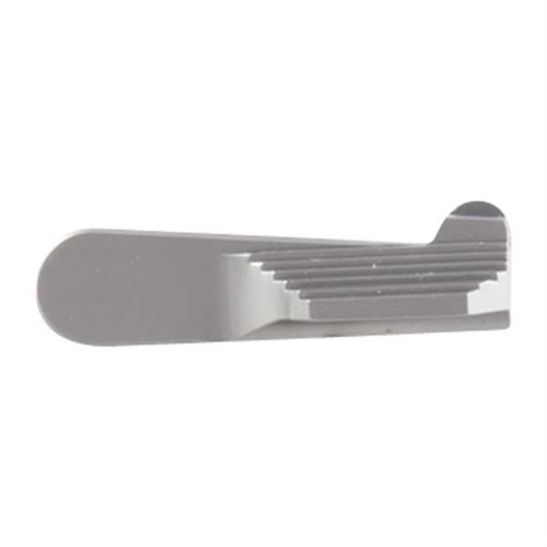 Redesigned slide stop is machined from bar stock for strength and contoured for easy, reliable, positive operation. Features a long, wide finger pad with aggressive serrations for excellent traction, and a .200" diameter pin for secure lockup and smooth operation. The engagement surfaces contacting the magazine follower and the slide notch have been modified and optimized for performance, while the rear face is angled so the detent plunger keeps it positively in place under recoil until the magazine is empty.