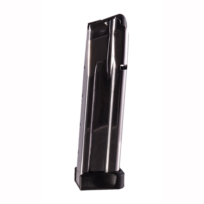 Complete, high capacity magazines. TIG welded, heat-treated, stainless steel bodies hold up to competition use without cracking or failure. All springs are tempered music wire, and fit STI bodies without trimming. Complete mags come with Polymer base pad and nylon follower for flawless feeding.