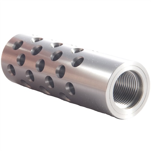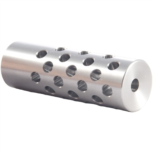 Yksinkertainen laajennuskammio ja yhteensä 42 porttia, joista 21 kummallakin puolella, 7° eteenpäin kallistettuna, tarjoavat maksimaalista rekyylinhallintaa. Huomioithan, että aseiden muokkaus on vaadittavaa. Tuote toimitetaan .220" (nimellinen) halkaisijaltaan olevan poistoreiän kanssa, joka on avattava .020" suuremmaksi kuin kuulan halkaisija. Tämä mahdollistaa kuulan koon suurentamisen jopa .44 kaliiperiin asti. Kompensattorin takapinta voidaan koneistaa vastaamaan piipun muotoa.