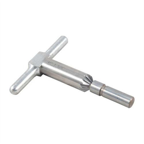 45° chamfering cutter rikkoo riflingin reunoja puhtaalle luodin poistolle tai chamferoi revolverin sylinterikammioiden suut nopeita latauksia varten. Setti sisältää cutterin, kahvan ja yhden pilotin, kaikki polypropeeniboxissa. Vaihdettava pilotti pitää cutterin oikeassa linjassa. Osta ylimääräisiä piloteja, jotta voit käyttää yhtä cutteria monilla eri kaliibereilla. Pilotteja muille kaliibereille on saatavilla erikseen. 45° Cutter, joka toimitetaan *-merkittyinä setteinä, on 5/8" halkaisijaltaan, mikä on tarpeen suurempien piippujen ja sylinterin suiden chamferoimiseen. Kaikilla muilla seteillä on ½" halkaisijaltaan, 45° cutter.