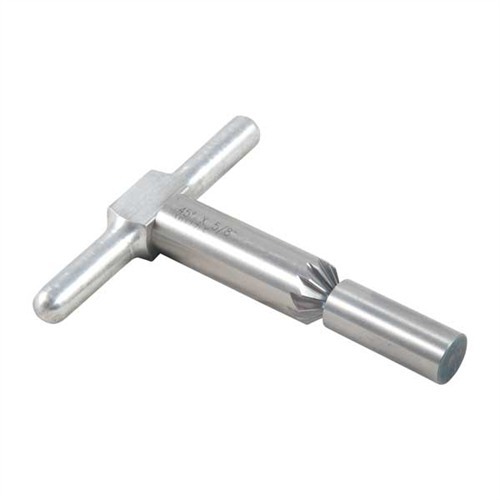45° chamfering cutter rikkoo riflingin reunat puhtaalle luodin poistolle tai chamferoi revolverin sylinterin kammiot nopeasti uudelleenlatausta varten. Pakkaus sisältää leikkurin, kahvan ja yhden pilotin, kaikki polypropeenilaatikossa. Vaihdettava pilotti pitää leikkurin oikeassa linjassa. Osta ylimääräisiä piloteja, jotta voit käyttää yhtä leikkuria monilla eri kaliibereilla. Pilotteja muille kaliibereille saatavilla erikseen. 45° Cutter, joka toimitetaan *-merkittyinä setteinä, on 5/8" halkaisijaltaan, jotta se voi oikein chamferoida suuremmat piipun ja sylinterin suut näissä kaliibereissa. Kaikilla muilla seteillä on ½" halkaisijaltaan, 45° leikkuri.