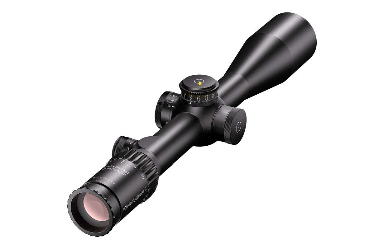 4060537014655 The 5–45×56 PM II High Power is a professional‑grade precision optic that merges a high‑performance riflescope with spotting‑scope capability. Designed for observation and ultra‑long‑range engagement, its enormous 9× zoom range (5–45×) makes it equally at home on reconnaissance, match, or tactical platforms where both identification and shot‑making accuracy are required. Engineered for extreme clarity and reach, the 56 mm objective delivers excellent light gathering while the optical system maintains a large usable field of view across the entire zoom range — allowing fast situational awareness at low magnification and razor‑sharp detail at high power. The reticle sits in the first focal plane, so hold‑offs and subtensions remain precise at any magnification. The model features robust, lockable turrets with fine 0.1 mrad click values and very large usable internal adjustment ranges tailored for extreme‑range correction. Built on a rugged 34 mm main tube, the High Power is constructed for demanding environments: it is fully weatherproof, fogproof and shock‑resistant. Despite its long reach, the design balances mechanical strength with practical ergonomics for field use. Standout Features Exceptional 5–45× magnification range for combined observation and precision shooting Large 56 mm objective for outstanding light transmission and image resolution First focal plane reticle for accurate ranging and holdover at any magnification Precision turrets with 0.1 mrad click value and extensive elevation/windage adjustment range Side/parallax adjustment for crisp focus from mid‑range to extreme distances High optical transmission (~90%) and illuminated reticle options for low‑light operations Robust 34 mm tube, weatherproof and built for professional use Key Specifications Magnification: 5–45× Objective diameter: 56 mm Main tube diameter: 34 mm Field of view: approx. 7.8–0.9 m @ 100 m Exit pupil: approx. 8.8–1.2 mm Eye relief: 90 mm Length: approx. 434 mm Weight: approx. 1,130 g Reticle: FFP (various tactical reticle options) Click value: 0.1 mrad Elevation adjustment range: ~27 mrad (internal ~29.6 mrad) Windage adjustment range: ±6 mrad (internal ~21.1 mrad) Parallax: adjustable Illumination levels: multiple (illuminated reticle available) Optical transmission: ~90% Designed and manufactured to professional standards, the 5–45×56 PM II High Power is the go‑to optic for operators and precision shooters who require unmatched versatility, extreme reach and uncompromising optical and mechanical performance.