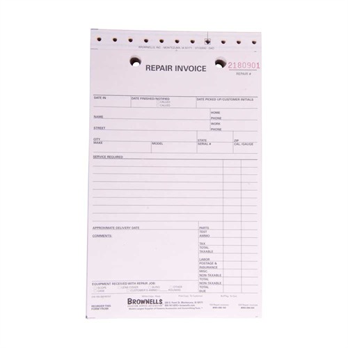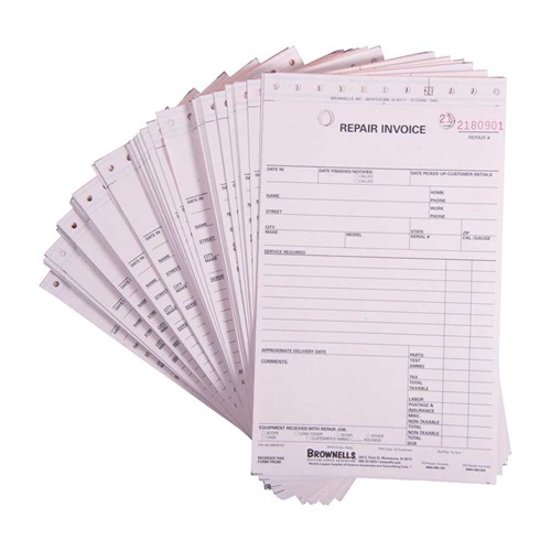 Two choices of gunsmith-designed forms for recording incoming repairs and tracking them through the billing process. Both styles have plenty of room to note requested repairs, work performed, and special notes by the gunsmith. Also includes space for gun and owner info and check-off blocks for items left with the gun (sling, lens covers, scope, etc.). Modern impression paper makes a duplicate copy without the mess of carbon paper. Plenty of room at the top to print or stamp your store or shop logo. 3-PART FORM - All-in-one, 3-part form includes has one copy for your customer, one for your bookkeeper, and one to stay with the gun. Each form is consecutively numbered for easy job tracking. Compact 5½" x 91⁄8" size, and punched to fit a 2-ring clipboard with standard 2¾" hole spacing.