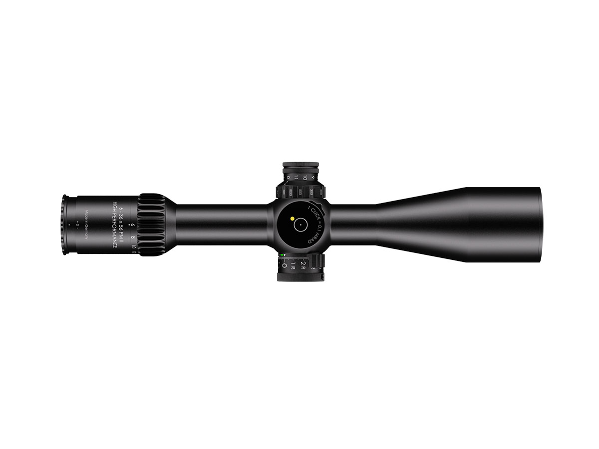 4060537065916 The 6‑36×56 PM II High Performance from Schmidt and Bender is a benchmark optic engineered for serious medium‑ to extreme‑long‑range shooting. With its expansive 6–36× magnification range and a generous 56 mm objective lens, it delivers exceptional clarity, reach and flexibility for demanding applications. Crafted on a robust 34 mm main tube, the scope is compact in length (approx. 390 mm) and relatively light for its class (around 940 g), yet built with the ruggedness and precision befitting the PM II series. The first‑focal‑plane (FFP) reticle ensures accurate hold‑overs, ranging and subtensions at every magnification level. With a transmission rating of well over 90 %, the optical system offers bright, high‑resolution imagery critical for target recognition at extended distances. Its field of view spans about 7.3–1.3 m @100 m, and the exit pupil ranges from approximately 8.3–1.6 mm, providing both wide situational awareness at lower magnification and finely‑detailed views at higher zoom levels. The eye relief is approximately 90 mm, ensuring comfortable viewing across shooting positions. The turret system features ultra‑fine 0.1 mrad click values, and the internal adjustment ranges exceed 40 mrad, giving the shooter a massive envelope for elevation and windage correction. The scope’s innovative “LPI” (Illuminated‑Parallax‑Integrated) system enhances usability, including left‑hand shooter compatibility and more mounting flexibility. Key Specifications: Magnification: 6–36× Objective Lens Diameter: 56 mm Main Tube Diameter: 34 mm Field of View: approx. 7.3–1.3 m @100 m Exit Pupil: approx. 8.3–1.6 mm Eye Relief: approx. 90 mm Transmission: >90% Click Value: ~0.1 mrad Length: approx. 390 mm Weight: approx. 940 g Designed and manufactured in Germany with highest precision, the 6‑36×56 PM II High Performance is ideal for professionals, competition marksmen or hunters seeking top‑tier optical clarity, mechanical integrity and flexibility across distances that demand elite performance.