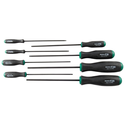 BROWNELLS TORX® DRIVER SET The Brownells TORX® Driver Set is a professional-grade toolkit designed to equip gunsmiths and firearm enthusiasts with the most commonly used TORX® drivers for firearm maintenance and accessory installation. This 8-piece set ensures you have the right tools to work on a wide range of TORX® screws found in various firearms and related equipment. Description and Features: Precision-Machined Steel Shafts: Each driver features a heat-treated, precision-machined steel shaft that provides exceptional strength and durability, ensuring reliable performance even when loosening stubborn screws. Ergonomic Handles: The drivers are equipped with comfortable, ergonomically shaped synthetic rubber handles that offer a secure, non-slip grip, enhancing control and reducing hand fatigue during extended use. Comprehensive Size Range: The set includes eight drivers in the following sizes: T-6, T-7, T-8, T-9, T-10, T-15, T-20, and T-25. Notably, the T-10 and T-15 drivers are compatible with scope ring and base screws from brands such as Brownells, Burris, and Leupold. Optimal Shaft Lengths: Shaft lengths are carefully selected to provide the best balance of reach and rigidity, ranging from 4¼ inches (T-6) to 5¾ inches (T-25), allowing access to screws in various positions without compromising strength. Durable Storage Pouch: The set comes in a reusable, heavy-duty clear plastic pouch that keeps the drivers organized and protected, making it convenient for both storage and transport. Specifications: Included Sizes: T-6, T-7, T-8, T-9, T-10, T-15, T-20, T-25 Shaft Lengths: 4¼ inches (T-6) to 5¾ inches (T-25) Handle Material: Synthetic rubber Shaft Material: Heat-treated steel Customer Insights: Customers have expressed high satisfaction with the Brownells TORX® Driver Set, highlighting its precision, durability, and ergonomic design. The exact fit of the drivers minimizes the risk of stripping screws, and the comfortable handles provide excellent control during use. Customers appreciate the comprehensive range of sizes included, which covers most TORX® screws encountered in firearm maintenance. Incorporating the Brownells TORX® Driver Set into your gunsmithing toolkit ensures you have reliable, high-quality tools designed specifically for efficient and precise firearm maintenance and accessory installation.