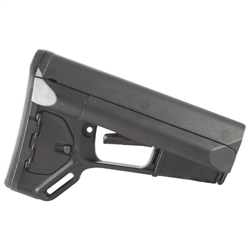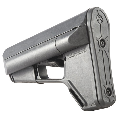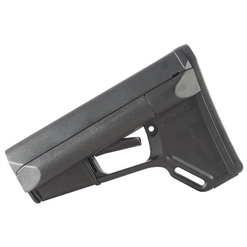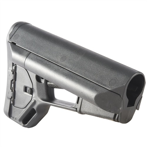 Adaptable Carbine/Storage (ACS) stock is a drop-in replacement for standard USGI M4 collapsible stock that gives the tactical operator extra storage options, a secure, comfortable cheekweld, and an advanced dual-locking lever. Smooth, streamlined exterior contours prevent snagging on clothing, sling, or vegetation, and help ensure fast exits from vehicles without snagging on gear. Removable battery storage compartments run the full length of the extra-wide comb and hold 2 AA or 3 CR-123 batteries, while providing a wide, contoured area for an exceptionally solid, comfortable cheekweld. Secure molded rubber caps keep water and dust out of compartments and face the rear of the stock for easy removal; cap exterior is beveled to resist snagging when shouldering weapon. Positive-locking trapdoor on right side of the stock reveals a roomy storage compartment for additional batteries, coiled up cleaning cable and other cleaning supplies, ear plugs, spare parts, or other small items. Magpul’s dual locking system uses an additional cam lever to protect the release lever from accidental operation, yet still allows you to adjust length of pull by simply pushing on the release lever. Slot molded in the toe provides an attachment point for a 1¼" wide sling. Also includes the same detachable rubber buttpad found on Magpul CTR and UBR buttstocks to help keep stock firmly mounted on shoulder. Mil-Spec fits 1.14" O.D. buffer tubes on Colt-manufactured M4 and similar mil-spec tubes that accept both four- and six-position collapsible stocks. Commercial fits larger, 1.17" O.D. commercial carbine buffer tubes. Buffer tube, carbine buffer, receiver extension nut, and carbine-length action spring not included.