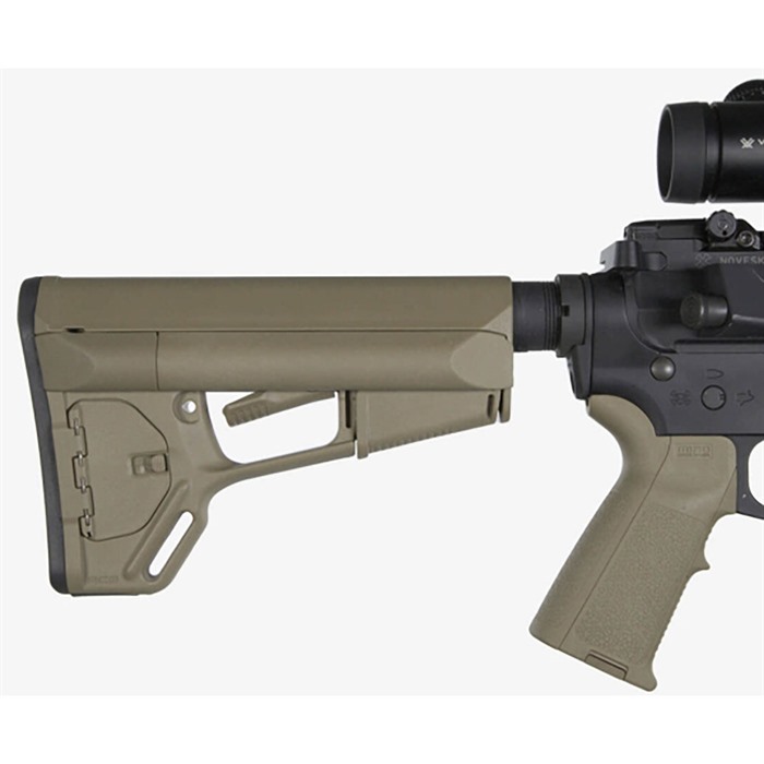 - Magpul’n kaksilukitusjärjestelmä käyttää lisäkammiota suojatakseen vapautusvipua vahingossa tapahtuvilta toiminnoilta, mutta antaa silti mahdollisuuden säätää vetopituutta yksinkertaisesti painamalla vapautusvipua.