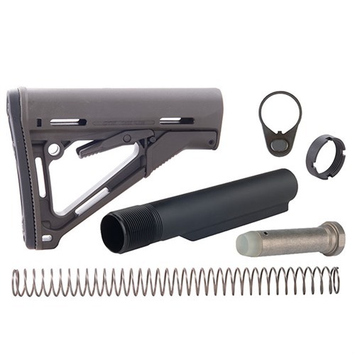 Brownells offers this kit that contains both the Magpul CTR buttstock and all mounting hardwear needed for an easy installation. Includes CTR buttstock, Mil-Spec buffer tube, carbine buffer, chrome silicon recoil spring, receiver end plate and castle nut. Features a friction locking mechanism that eliminates movement between the buffer tube and buttstock for a solid “feel” when mounting rifle to shoulder. Heavy duty, spring-loaded hand lever allows fast length-of-pull adjustments. Nylon polymer body provides maximum impact and heat resistance, with molded-in reinforcements at stress points. Accepts a variety of ambidextrous sling attachment options, including web slings and single-point, push-button sling mounts. Comb contour is wider than standard issue M4 stock to help shooter maintain a solid cheekweld. Synthetic rubber buttpad increases comfort and helps prevent slippage. Fits buffer tubes that accept both four- and six-position collapsible stocks. Available in Black, Dark Earth, Gray and O.D. Green, so you can match the color of your stock to your tactical rifle's color scheme. Mil-Spec fits smaller 1.14" O.D. buffer tubes on Colt-manufactured M4 and similar mil-spec carbines.