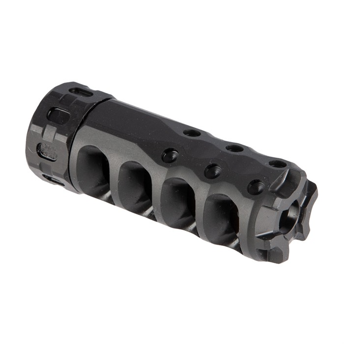 Developed from the ground up and backed by knowledge gained from years of pushing the edge of muzzle device performance, the Hypertap muzzle brake delivers more than Precision Armament have ever offered before. Their proprietary Hybrid Baffle Design combined with advanced Convergent-Divergent port geometry yields an unprecedented recoil reduction of over 70% on 308 Winchester and over 78% on 6.5 Creedmoor, while also maintaining modest 35-degree baffle angles and generous bore clearance. This results in exceptional safety, less gas blowback, better accuracy, and higher overall shooter comfort than any other device in its class. Fully tunable gas biasing allows the shooter to further reduce, or even eliminate, sight picture movement while firing. An integral universal timing nut eliminates the need for shims and allows quick field installation & removal using an adjustable wrench or the lightweight spanner tools (included). Additional features include: zero flash increase, compact lightweight design, a rugged skeletonized crown, cleaning friendly design, heat-treated stainless steel construction, a tough Ionbond® CrCN finish for superior durability and, as always, 100% Made in the USA.