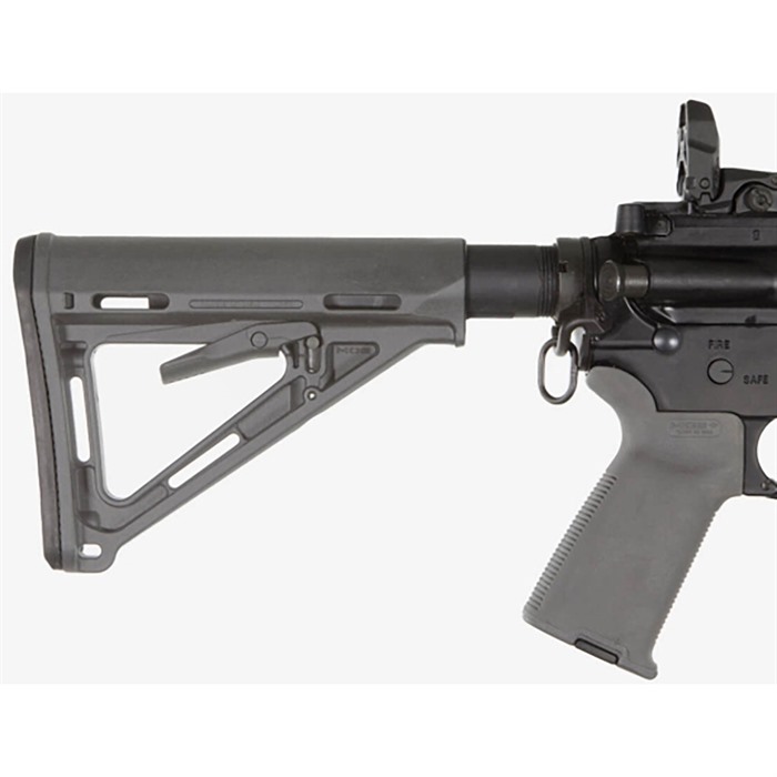 Magpul Original Equipment (MOE) carbine buttstock provides the quality, durability, and ergonomic benefits of Magpul’s CTR stock in a rugged, economical, drop-in package. Strong, A-frame design is lightweight and comfortable, yet provides operator with plenty of support. Comb contour is wider than standard issue M4 stock to help shooter maintain a solid, consistent cheekweld. Streamlined exterior and protected release lever won’t snag on clothing, gear, vehicle interior, or vegetation. Heavy duty, spring-loaded release lever allows fast length-of-pull adjustments and won’t dig into your hand. Impact- and heat-resistant, polymer construction includes molded-in reinforcements at stress points, plus two slots for web slings and a hole for a toe-mounted sling swivel or clip-on sling. Soft, synthetic rubber buttpad increases comfort and helps prevent slippage. Mil-Spec fits 1.14" O.D. buffer tubes on Colt-manufactured M4 and similar mil-spec tubes that accept both four- and six-position collapsible stocks.