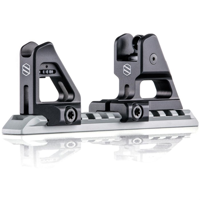 Scalarworks Peak Iron Sights are for shooters who want the familiarity of classic AR-15 fixed sights, with upgrades to make them more suitable for modern tactical carbines. The Scalarworks crew designed the Peaks for a 15" sight radius, making them far more suitable for AR-15 carbine use than old "A2" sights designed for an M16A2 rifle’s 20" radius. Peak Iron sights are manually adjustable for elevation (front) and windage (rear) in 1/2 MOA clicks. The front sight post is machined to the correct width for the 15" sight radius and its flat-face eliminates highlight bias. The rear sight’s peep presents a flat surface to the shooter as well to prevent distorting shadows and/or glare caused by the mil-spec A2 peep’s concave rear face. Machined 7075 T6 aluminum - far stronger than standard 6061 alloy Black Mil-A-8625 Type III hardcoat anodized 4140H steel hardware with Black Nitride finish 36mm (1.42") height over rail Front post: 1.35mm wide Rear flip apertures: 1.78mm (.07") and 5.08mm (.20") As a bonus, Peak Fixed Sights are designed to sit 36mm above the rail, making them ideal as backup sights for an Aimpoint optic mounted on a Scalarworks Leap Mount (available separately). Mount a set on your carbine and see just how effective iron sights can be!