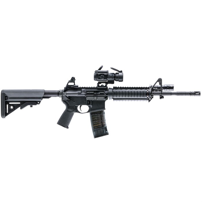 - Manuaalisesti säädettävä korkeus (etu) ja tuuli (takana) 1/2 MOA askelilla.
