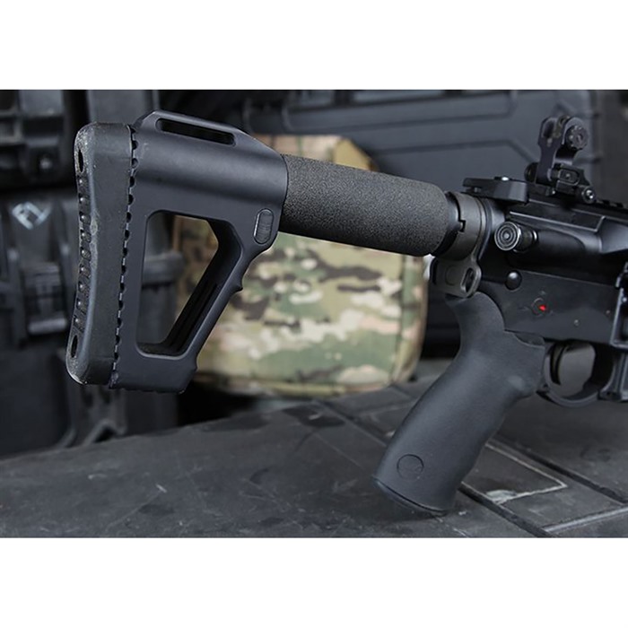 SPECS: 6061-T6 heat-treated, aircraft grade aluminum, Type 3, mil. spec. hard-anodized, matte finish. Includes ½" thick, rubber recoil pad and screws. Carbine - 7½" (19cm) OAL collapsed, extends to 9½" (24cm) OAL. 10½" (27cm) L.O.P. collapsed, extends to 12½" (32cm) L.O.P.