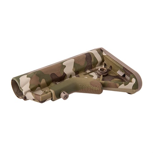 B5 SYSTEMS BRAVO COLLAPSIBLE MIL-SPEC STOCK FOR AR-15 Building upon the success of the B5 Systems Enhanced SOPMOD, B5 has taken the features end users demand; offering them in a lighter, more compact, and stronger buttstock. The Bravo stock maintains the SOPMOD cheek weld, one piece anti-rotation quick disconnect sling mount, non-slip cushioned buttpad, and improved sure grip stock latch. The Bravo omits the storage capability of the SOPMOD to provide a slimmer profile and angles the rear of the stock ensuring quick and consistent stock placement against the shoulder and cheek. Made of Mil-Spec materials and finishes. Currently employed by the U.S. military, this reinforced polymer stock fits M4-type receiver extensions and offers an improved cheekweld designed for increased comfort and consistency. Streamlined contours resist snagging on clothing, equipment, or vegetation to aid in safe and stealthy operation. Sure-Grip stock latch ensures convenient and intuitive length-of-pull adjustment, while the anti-slip rubber recoil pad secures the weapon to the operator’s shoulder. Features a black, stainless steel QD swivel mount and two molded 1¼" wide sling slots. FEATURES Ergonomic Cheek Weld Color-Matched Steel Hardware Fixed Sling Mounts and Steel Anti-Rotational QD Mounts Cushioned Non-slip Buttpad with Built in M4 Multi-Tasker® Tool Holder (tool sold separately) Sure Grip Stock Latch Made of MIL-SPEC Materials and Finishes Fits MIL-SPEC Carbine Receiver Extensions SPECS Weight: 9.3 oz Length: 7.2 in Width: 2 in Height: 4.9 Black and Tan models are TACOM approved and on the Additional Authorization List (AAL) for the M4/M4A1. Black NSN: 1005-01-706-2373 Flat Dark Earth NSN: 1005-01-706-2510