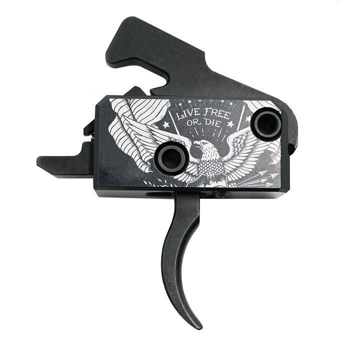 The RISE Armament Rave 140 is the gen 2 of the best-selling RA-140 Super Sporting Trigger (SST). Clean break with a short reset Enhanced accuracy by minimizing gun disturbance Allows faster initial and follow up shots when compared to a standard trigger Curved trigger blade for enhanced control and lighter feeling pull weight Single stage trigger system Drop safety feature Features a special-edition eagle design and the phrase ""Live Free or Die"" on the housing Unit weight: 2.6oz CNC precision machined from high grade, heat treated tool steel and aluminum Black anodized cassette housing Fits AR-style platforms built to Mil-spec dimensions (calibers include .223/5.56, .308, 6.5, 9mm and more) Backed by RISE Armament's Lifetime Guarantee Colr Black Trigger Pull Weight 3.5lbs additional Walking Pins included