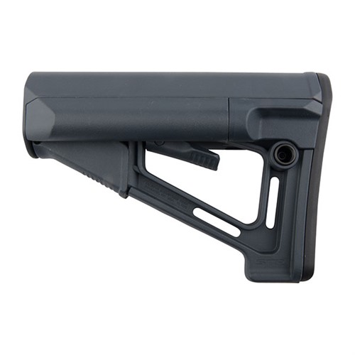 Magpul CTR® -varaston paranneltu versio, STR (“Storage/Type Restricted”) -peräosa, sisältää kaksi 4¼" vasemman ja oikean puolen akkuvarastoputkea sekä leveämmän poskituen lisämukavuutta varten. Takana olevat kumikorkit pitävät varastotaskut vedenpitävinä, mutta ne voidaan helposti irrottaa pääsyä varten kahteen AA- tai kahteen CR-123 -akkuun.