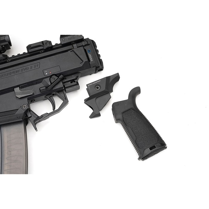 The Strike Industries AR Pistol Grip Adapter for CZ Scorpion allows you to use your favorite AR style pistol grip on the CZ Scorpion platform. Compatible for the CZ Scorpion EVO and 3+, this adapter can be used with both beavertail and flat top AR pistol grip designs. Machined from 6061-T6 aluminum, this grip adapter is lightweight and high-strength. The Strike Industries AR Pistol Grip Adapter for CZ Scorpion gives you better ergonomics and no pinched fingers from the CZ selector switch plus a perfect pairing with one of the various SI AR Grips available. Package Contents: x1 AR Pistol Grip Adapter for CZ Scorpion x1 Upper receiver pistol grip screw hole gap filler x1 Set screw (M4x29mm) x1 Torx tool [T20] x1 Loctite® Threadlocker Blue 243® Product Features: Adapter for CZ Scorpion to use AR pistol grips For both AR pistol grips with beavertail or flat top designs Included gap filler for upper receiver oval screw hole Lightweight and high-strength Machined from 6061-T6 Aluminum Perfect pairing with one of the various SI AR Grips available COMPATIBILITY: All CZ Scorpion EVO models including 3+ DISCLAIMER: “CZ”, “CZ Scorpion Evo 3”, are federally registered trademarks of CZ-USA. and is one of many trademarks owned by CZ-USA. Neither Strike Industries Inc. nor this site are affiliated in any manner with, or otherwise endorsed by, CZ-USA. The use of “CZ” on this page is merely to advertise the sale of CZ-USA pistols, parts, or components. -CALIFORNIA PROPOSITION 65 WARNING:- WARNING: This product contains chemicals known to the State of California to cause cancer and birth defects or other reproductive harm. For more information: www.P65Warnings.ca.gov
