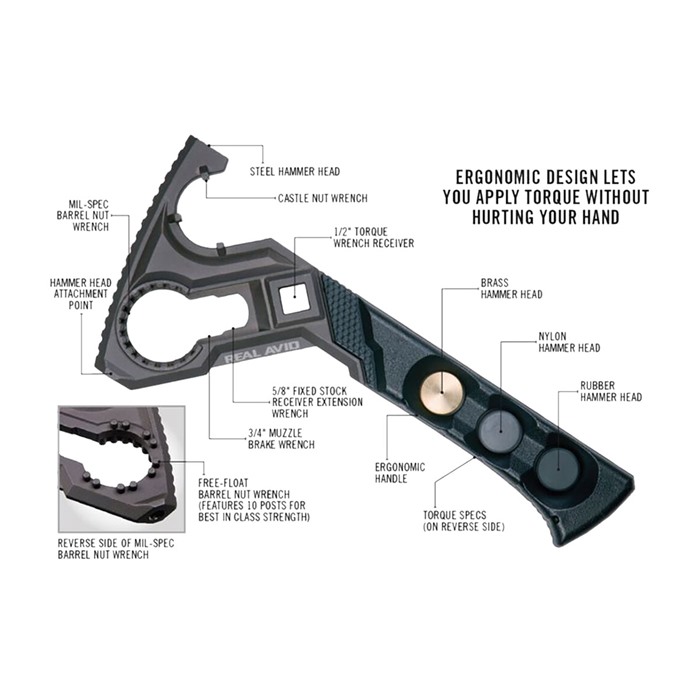 ARMORER'S MASTER WRENCH The Real Avid Armorer's Master Wrench is a comprehensive tool engineered for AR-15 enthusiasts and professional gunsmiths, facilitating efficient assembly, maintenance, and customization of AR-15 rifles. Its ergonomic design and precision surfaces ensure secure handling and accurate application during various tasks. Key Features: Versatile Engagement Surfaces: Designed to mount barrel nuts, castle nuts, muzzle devices, and fixed-stock receiver extensions, accommodating a wide range of AR-15 components. Ergonomic Grip: Coated with a special no-slip material, the wrench provides a secure and comfortable grip, enhancing control during use. Integrated Hammer: Features a hammer on the reverse side of the head, complete with interchangeable heads, allowing Customers to select non-marring surfaces when installing pins and other components. Specifications: Compatibility: AR-15 platforms Material: Durable steel construction with a no-slip coating Additional Tools: Interchangeable hammer heads included Customer Insights: Our customers commend the Real Avid Armorer's Master Wrench for its multifunctional design and robust construction. The precision surfaces and ergonomic grip enhance the ease of mounting various components, while the integrated hammer with interchangeable heads adds versatility, particularly appreciated during pin
