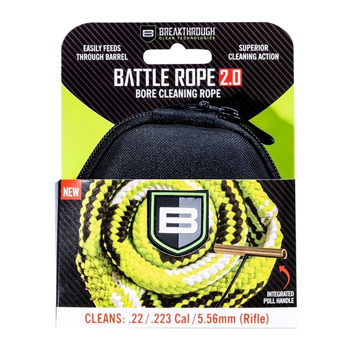 For fast, easy cleaning of your gun's bore, there's nothing like a pull-through rope, and this Breakthrough Clean Battle Rope 2.0 takes this proven cleaning system to the next level. Each Breakthrough Clean Battle Rope 2.0 is a second-generation design that's been revamped to provide enhanced cleaning action. The rope features an integral bronze brush that's paired with a removable nylon bristle brush that cleans your gun bore twice as much as any other cleaning rope. There's a threaded end on this rope that allows you to take off the nylon bristle for easy cleaning and replacement, and the rope even features a patented cable section designed for insertion into your gun's ejection port, so you don't even have to field-strip your firearm! The Breakthrough Clean Battle Rope 2.0 is available in a range of caliber options for shotguns, rifles and handguns, and you can easily identify which rope goes to what caliber, thanks to the permanently attached caliber tag. You'll also receive a hard-sided storage case and carabiner that allows for easy attachment to your range bag, ensuring you can keep your dedicated cleaning tool with you at all times.