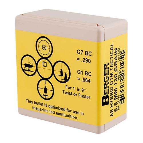 Berger 130 Grain AR Hybrid OTM (Open Tip Match) Tactical -kuulat hyödyntävät alan johtavaa hybridiohjusta, joka yhdistää tangentti- ja sekanttiperusteiset suunnittelut tehokkuuden optimointiin, tuulen vaikutuksen vähentämiseen ja herkkyyden minimointiin istutus syvyyden suhteen. Hybrid OTM Tactical -kuulat ovat kilpailuissa todistettuja ja ne ovat suosikkeja tämän päivän huippupitkän matkan kilpailuampujien keskuudessa.