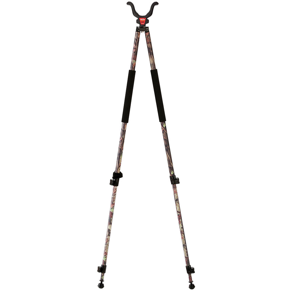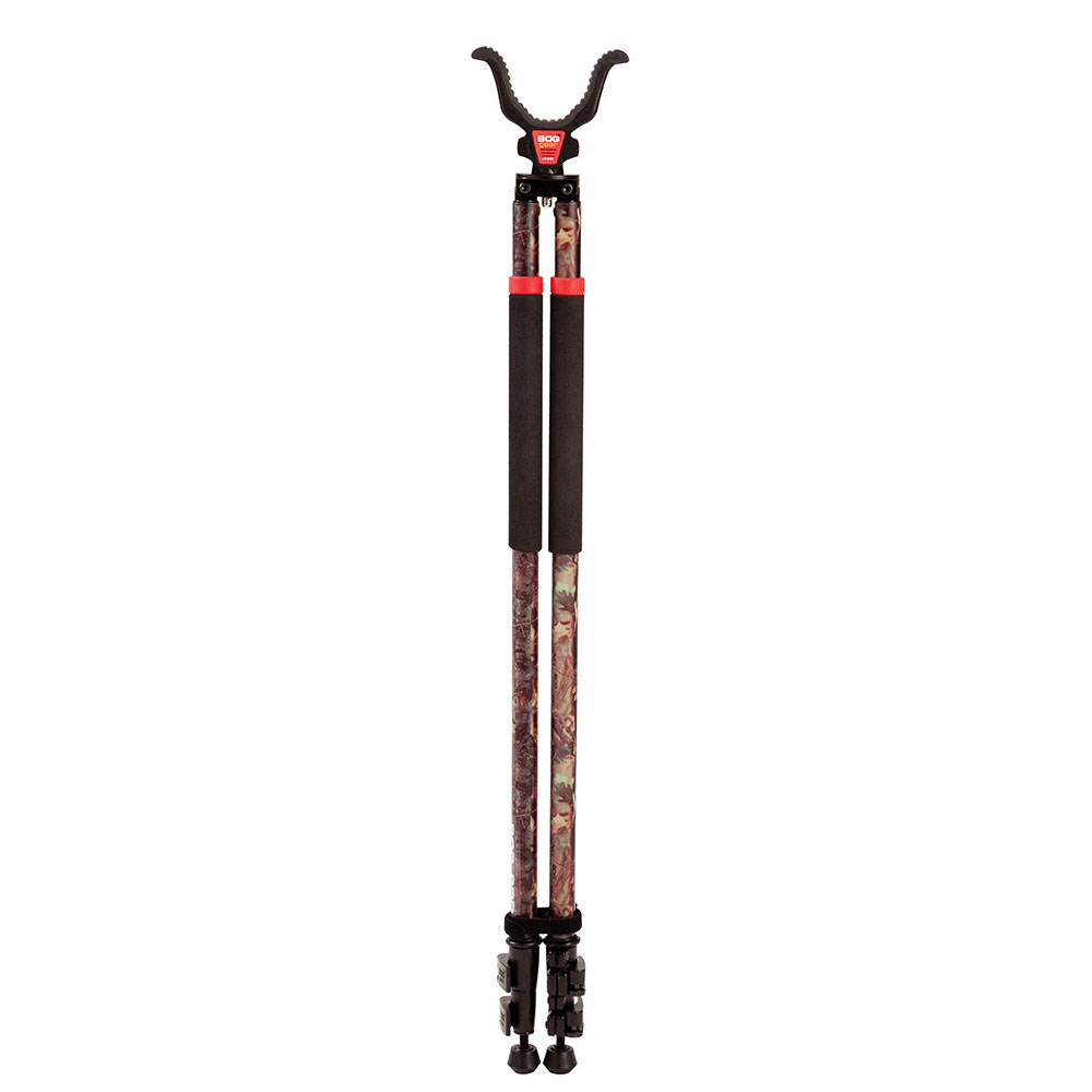 BOG CLD-2 Devil Tripod tarjoaa vakauden, nopean jalkasäätimen ja kierrettävät piikit, kaikki camouflagen ja mustien pehmustettujen kahvojen kera.