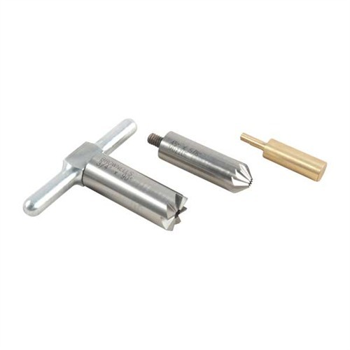 050806012790 Setti sisältää: yksi, 90° tasoitusleikkuri piipun suoristamiseen lyhentämisen jälkeen tai vaurion korjaamiseen; yksi, 45° viisteleikkuri riflausreunojen murtamiseen puhtaan luodin poistumisen varmistamiseksi tai revolverin sylinterin suun viistelemiseen nopeita uudelleenlatauksia varten; sekä yksi kahva, joka sopii kummallekin leikkurille ja yksi messingistä valmistettu bore pilotti. Vaihdettavat pilotit pitävät leikkurin kunnolla linjassa. Osta ylimääräisiä piloteja käyttääksesi yhtä leikkuria monille eri kalibereille. Pilotteja muille kalibereille saatavilla erikseen.Jälkitilaus, toimitusaika n. 4-12 viikkoa USA:n varastosta.