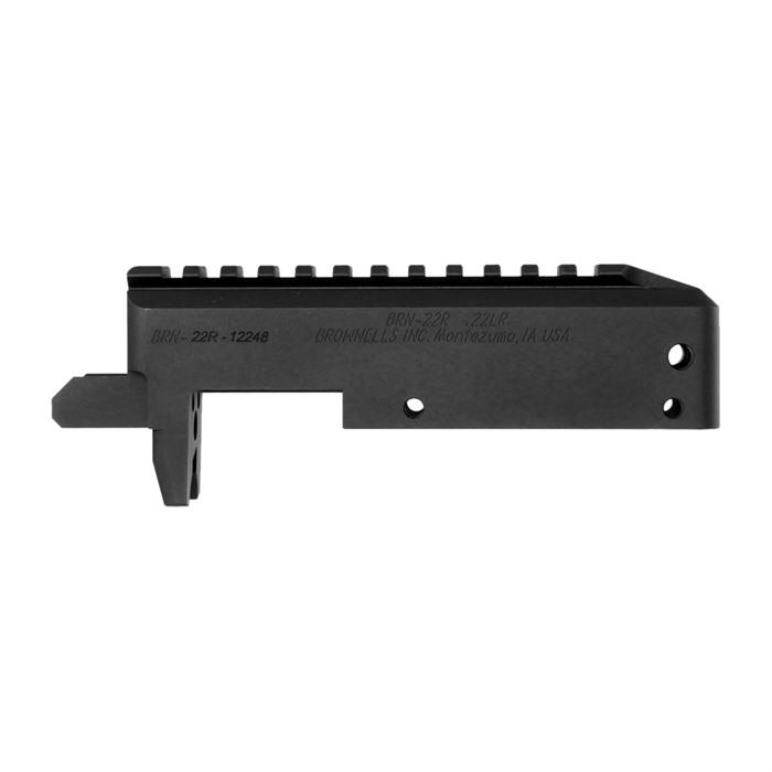 The Brownells BRN-22 Receiver is ready to be the foundation of your custom rimfire rifle build - at price never before seen on a target receiver. Even better, the BRN-22 is fully compatible with the ever-popular Ruger® 10/22®, so you can choose from the vast array of barrels, stocks, triggers, and other custom components for the 10/22® platform. Each BRN-22 receiver is precision-machined from 6061 aluminum billet to exacting tolerances. Why machined instead of forged, like most commercial receivers? All you need to do is look inside at the smooth, clean interior to realize that a machined receiver can be held to much tighter tolerances for a precise fit with other parts. After machining, BRN-22 receivers get a tough matte black Type 2 hardcoat anodized finish (similar to the finishes found on many AR-15 receivers) that blends with most barrel and 10/22® trigger module finishes. There’s even a pre-drilled cleaning rod hole at the rear of each Brownells BRN-22 receiver for easy cleaning of the bore from the chamber, the PROPER way to prevent cleaning rod from damage to the muzzle crown that can compromise accuracy. Stripped receiver only Comes with V block and screws Machined from high-grade 6061 T6 aluminum billet Durable matte black hardcoat anodized finish Compatible with all components that fit a factory Ruger® 10/22® Cleaning rod access hole at rear Barrel and receiver sold separately - Click here to see separate listing FFL or delivery to an FFL holder required for purchase The Railed BRN-22R has an integral Picatinny top rail for extra security and versatility in scope mounting. Get a BRN-22 stripped receiver today and start planning your rimfire rifle Dream Gun™. At these prices, why not get several? The possibilities are endless! Due to varying dimensions in aftermarket and some older factory aluminum trigger housings, fitting may be required. The BRN-22 receivers are designed to work in conjunction with Ruger® 10/22® OEM bolts, and as such may not work with all aftermarket bolts.