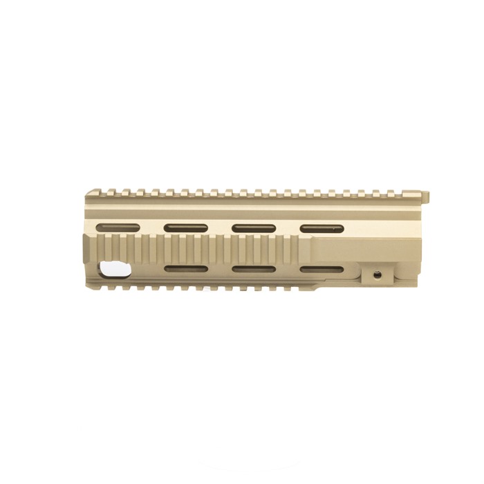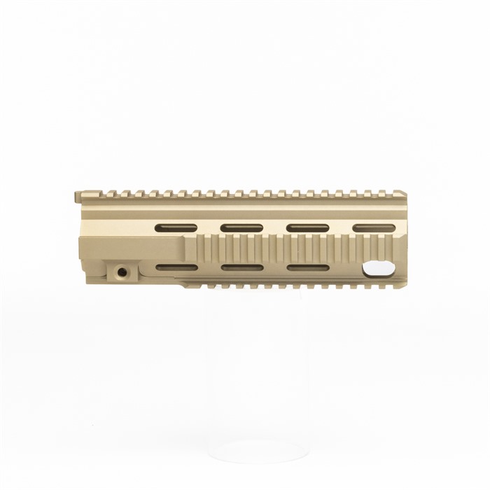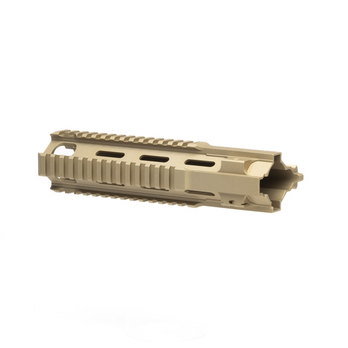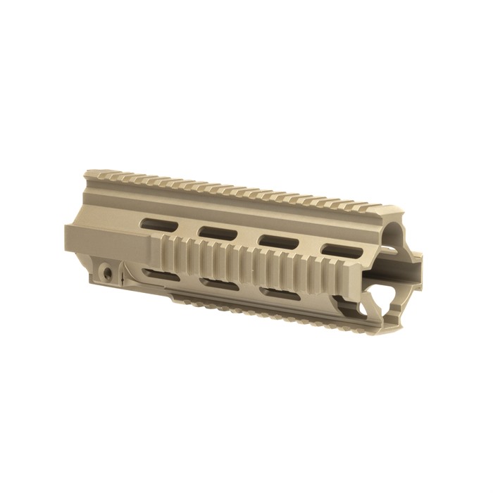 “M27” inspired Quad Rail Handguard for the BRN-4™ and HK® 416 platforms Available in 11 and 9 inch lengths, the BRN-4 M27 handguards are suitable for a variety of barrel lengths and applications. The 11 inch model is right at home with the BRN-4 M27 16 inch barrel, as it covers up the gas block and provides plenty of picatinny rail real estate on a rifle platform. The 9 inch model is right at home on carbine builds, especially a handy 10.4” model. Unique to Brownells BRN-4, these quad rail handguards are available in Flat Dark Earth. The handguard by itself on a matte black upper receiver has a distinct and unique look, and breaks up the overall profile of the firearm. Also unique on the Brownells BRN-4 quad rail handguard compared to similar handguards, is the machined in locking bolt hardware. This ensures the clamping forces are evenly spread to the body of the handguard, optimizing clamping force. You don’t have to worry about zero shifting with this setup. Indexing tab at the top interfaces with the BRN-4 upper receiver and prevents rotation.Handguard attaches directly to any Brownells BRN-4 upper receiver group, and is also compatible with HK®, 416, MR556 and MR223 platforms.
