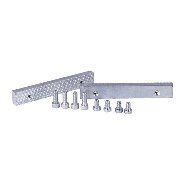050806001015 Erityiset leuat auttavat sinua saamaan kaiken irti Brownellsin työpöydästä. Visiin lisättävät leuat liukuvat Brownellsin Gunsmithin työpöydän vitsiin kiinnitettyjen tehtaalle asennettujen leuoiden päälle, ja niiden avulla voit räätälöidä vitsisi erityisiä projekteja ja työpalikoita varten. Ne on päällystetty erilaisilla materiaaleilla, jotka auttavat pitämään osat tukevasti paikoillaan samalla, kun vaurioitumisen tai naarmuuntumisen riski minimoidaan. Lisäosat on valmistettu kevyestä mutta kestävästä alumiinista, ja ne pidetään paikallaan visissä voimakkailla harvinaisilla maamagneeteilla. Alumiinimateriaali estää magneetteja magnetoimasta teräksisiä osia, joita pidetään leuoissa. Prismapehmeät leuat - Polyuretaanista valmistetut prismaleuat on suunniteltu tukevasti kiinnittämään herkkiä pyöreitä ja soikeita työpalikoita ilman vaurioitumisen riskiä. Polyuretaanissa olevat erilaiset kokoiset "prism"-muotoiset aukot auttavat asettamaan työpalikat tukevasti paikoilleen. Pehmeä polyuretaanipinta on äärimmäisen joustava, mutta kestävä muodonmuutoksille tai pysyvälle "asetukselle". Kun paine poistetaan, ne palaavat alkuperäiseen muotoonsa. Tämä materiaali ei myöskään kovetu iän myötä. Ruudulliset pehmeät leuat - Nämä polyuretaaniset leuat sisältävät ainutlaatuisen "ruudullisen" kuvion tartuntapinnoilla, jotta ne pitävät herkkiä pieniä osia vaurioitumatta. Pehmeä polyuretaanipinta on äärimmäisen joustava, mutta kestävä muodonmuutoksille tai pysyvälle "asetukselle". Tämä materiaali ei myöskään kovetu iän myötä. Prismialumiinileuat - Nämä lisäosat ovat kovuudeltaan kuparin ja lyijyn välissä ja on suunniteltu tukevasti kiinnittämään pyöreitä/soikeita esineitä Brownellsin työpöydässä. Yksi vaakasuora prismamuotoinen aukko ja kolme erikokoista pystysuoraa prismamuotoista aukkoa on suunniteltu pyöreiden tai soikeiden työpalikoiden tukevaksi kiinnittämiseksi. 90° aukko leuoissa on suunniteltu vaakasuoralle kiinnittämiselle tasaiselle materiaalille. Uralliset alumiinileuat - Auttaa sinua kiinnittämään sylinterimäisiä työpalikoita Brownellsin visissä. Kuusi vaakasuoraa uria pitävät työpalikat tukevasti paikoillaan, kun taas syvempi keskiura kiinnittää pultit, tangot, nastat ja muut sylinterimäiset osat tukevasti, kun työskentelet niiden parissa. Kovuus on kuparin ja lyijyn välissä, joten nämä leuat ovat luonnollisesti paljon pehmeämpiä kuin mikään teräksinen esine, jota ne tarttuvat, joten et vahingoita työpalikkaa. Kuituleuat - Näiden leuoiden tiheä kuitumateriaali pitää tukevasti hienosti koneistettuja tai kiillotettuja osia. Kuitu ei vahingoita kiillotettua pintaa. Tiheät kuitukerrokset ovat lämpöä kestäviä eivätkä muutu muotoa lämmitettäessä. Kumileuat - Suunniteltu erityisesti erittäin herkille puu- ja muoviosille sekä ohuille putkille, nämä leuat ovat pehmeällä, synteettisellä kumipinnalla, joka pitää herkkiä työpalikoita, jotka kestävät vain erittäin kevyttä puristusvoimaa. Kumimateriaali on vahvistettu kolmella kerroksella kangasta, mikä vastustaa kumin joustavuuden taipumuksia ja tarjoaa riittävästi jäykkyyttä pitää osan tukevasti paikoillaan. Huopaleuat - Nämä leualisäosat sisältävät huopapinnan, joka on suunniteltu erittäin herkkiä työpalikoita varten. Erityinen kulutuskestävä huopamateriaali mukautuu tiiviisti työpalikan muotoihin, joten minimaalista puristusvoimaa tarvitaan osan pitämiseen paikoillaan. Jopa herkimmät työpalikat voidaan kiinnittää vahingoittamatta niitä. Korvaavat tehdas teräksiset leuat - Nämä ovat samoja teräksisiä leuoja, jotka asennettiin Brownellsin Gunsmithin työpöydälle, kun se oli uusi. Ajan myötä alkuperäiset leuat saattavat kulua tai vahingoittua. Ne voidaan helposti vaihtaa poistamalla vain kaksi pulttia, jotka kiinnittävät jokaisen leuan, ja korvaamalla ne näillä. Pultit asetetaan leuan rungon ulkopuolelta, mikä tekee niiden asentamisesta helpompaa ja vähemmän todennäköistä vaurioitua. Kuten alkuperäiset, nämä leuat sisältävät sekä sileän pinnan että "ruudullisen" tekstuuripinnan. Käytä puolta, joka toimii parhaiten käsillä olevaan projektiin.Toimitusaika noin 5-7 päivää.