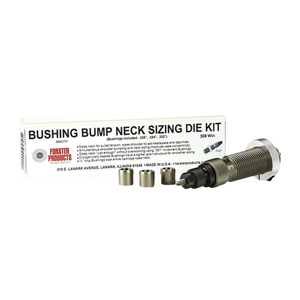 Forsterin Bushing Bump Neck Die Kits -sarja tarjoaa tarkkuuslataajille mahdollisuuden hallita tarkasti patruunoiden kaulusten jännitystä. Jokainen näistä kokoonpanosarjoista sisältää käsin hiotun kokoonpanodie, joka vastaa täydellisesti aseesi kaliiperia, sekä kolme Forsterin henkilökunnan valitsemaa käsin valittua bushing-kokoa.
