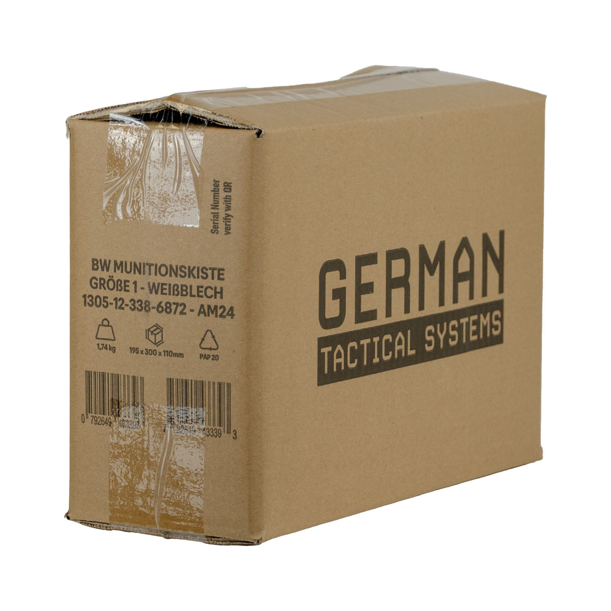 German Tactical Systemsin Size 1 Ammo Can (BW) on täydellinen valinta turvalliseen ja luotettavaan säilytykseen. Valmistettu kestävästä tinapeltiteräksestä, tämä ammo can suojaa erinomaisesti pölyltä, kosteudelta ja mekaanisilta vaurioilta, olipa kyseessä käyttöönotto, varastointi tai liikkuminen.