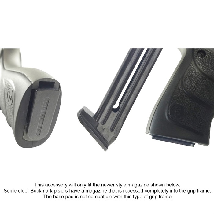 Huomio: Browning Buck Mark -patruunalaatikoita on useita tyyppejä. Tämä lisävaruste sopii vain uudemman mallin patruunalaatikkoon. Joissakin vanhemmissa Buckmark-pistooleissa on patruunalaatikko, joka on täysin syvennetty kahvarunkoon. Tämä peruslaatta ei ole yhteensopiva tämän tyyppisen kahvarungon kanssa.