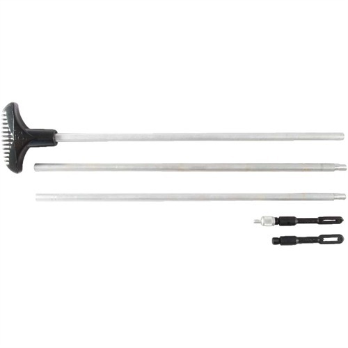 Aluminum and steel rods for Handguns, Rifles and Shotguns. Handgun rod is one-piece with swiveling handle. Standard 8-32 thread for brushes, etc., comes with .22, .38 and .45 jags. Rifle rods are three-piece with swiveling handle. Standard 8-32 thread for brushes, etc. A Knob (jag) tip and Slotted tip are included. .22 Caliber rod works for .22 to .270. .30 Caliber rod works for .30-.35. Both can use larger/smaller jags, and brushes for other calibers. Shotgun rod - Aluminum only. Three pieces, does not swivel. Includes two slotted tips for .410 through 12 gauge. 5⁄16"-27 thread.