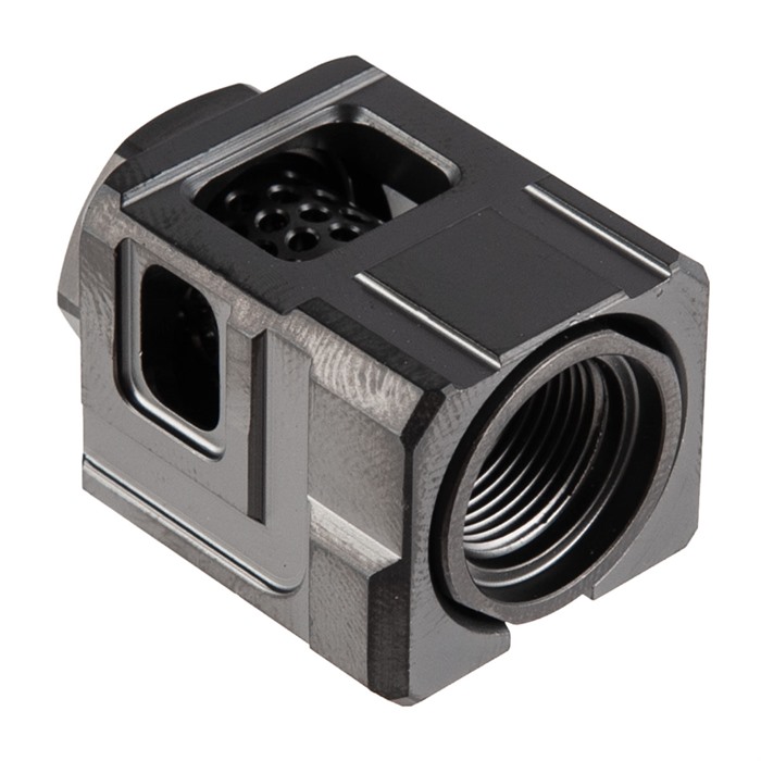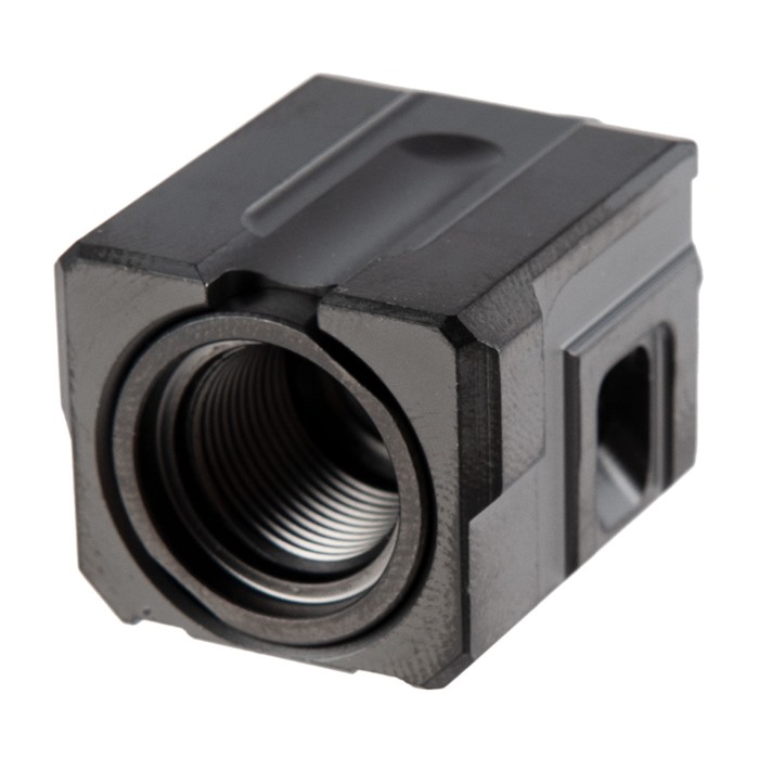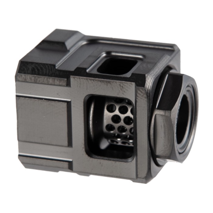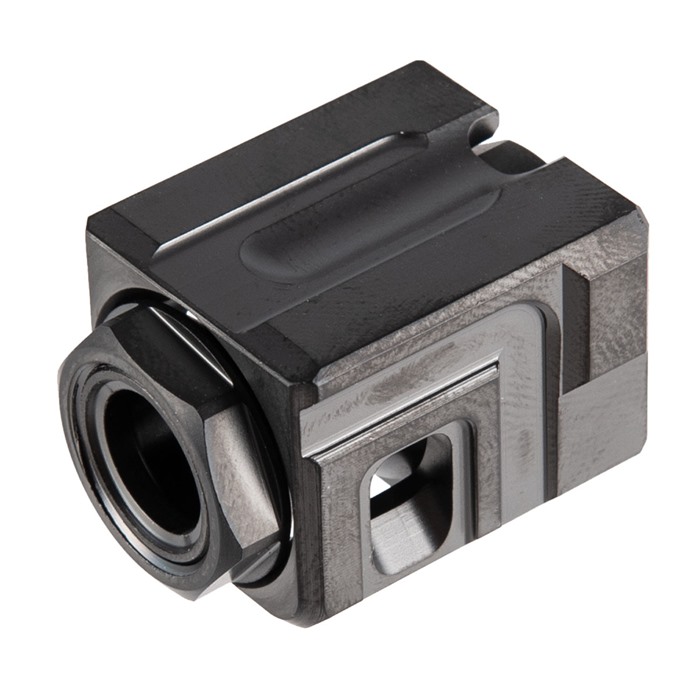 Tämä Qube-kompensatori Glockillesi on ensimmäinen äänenvaimennin, joka ei vaadi kiinnittämiseen käytettävien säätöruuvien käyttöä. Sen sijaan tämä järjestelmä käyttää vääntömomenttipohjaista järjestelmää varmistaakseen, että se pysyy tukevasti paikallaan, mikä johtaa vähemmän osia, jotka voivat löystyä tai kadota laukauksen aikana. Jokainen Qube-kompensatori on suunniteltu sopimaan moniin nykypäivän suosittuihin Glock-pistoolimalleihin, mukaan lukien G17, G19, G19X, G26, G34 ja G45, kunhan aseet on varustettu kierreputkilla. Kompensatorin kiinnitys voidaan saada joko 1/2-28 tai M13.5-1LH kierteillä, jotka vastaavat isäntäputkea. Tämä kiinnitys tarjoaa kartiomaisen lukitusjärjestelmän, joka varmistaa, että kompensatori ei pyöri pitkillä ampumasarjoilla. Jokainen Qube-kompensatori on mitoiltaan 1,25 tuumaa pitkä, 0,825 tuumaa korkea ja 1 tuuma leveä. Äänenvaimennin on valmistettu 17-4H900 ruostumattomasta teräksestä ja sen paino on 2,4 unssia.Valmistaja poisti ohjelmasta
