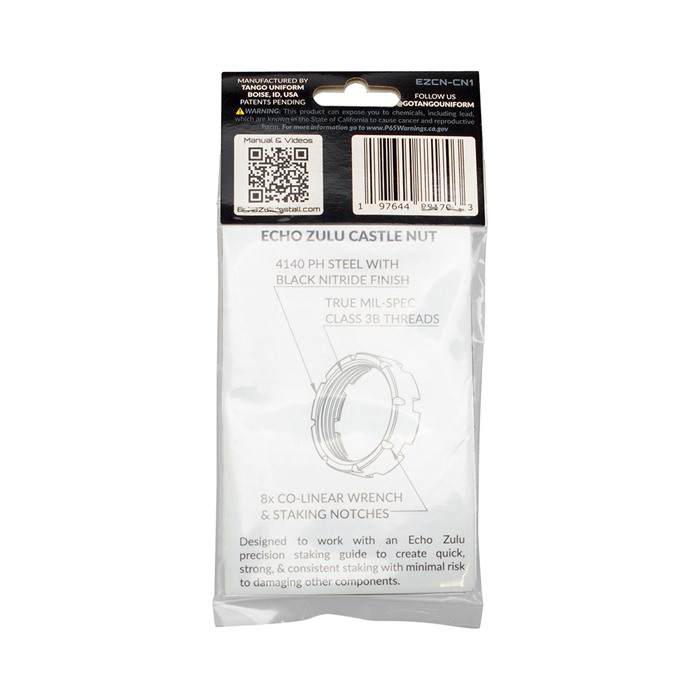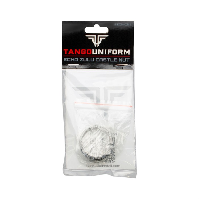Echo Zulu Castle Nut -järjestelmä mahdollistaa AR:n castle nutien asennuksen nopeammin, turvallisemmin ja johdonmukaisemmin. Tango Uniformin patenttihakemuksessa oleva EZ castle nut on valmistettu korkealaatuisesta 4140 PH seosteräksestä ja viimeistelty pitkäkestoisella, timanttikovuudella mustalla nitridepinnoitteella.