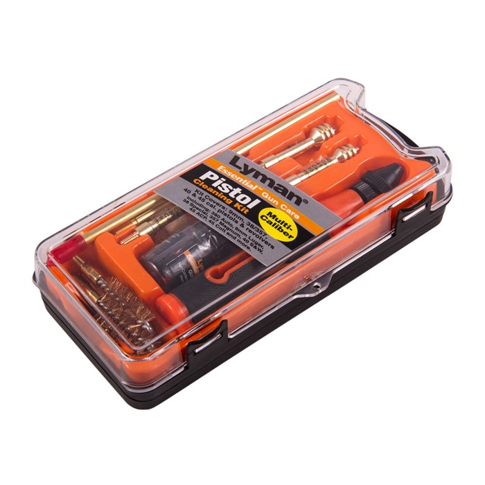 Lymanin monikäyttöinen pistoolin puhdistussarja puhdistaa useita eri pistoolikaluja, mukaan lukien - .380 auto, 9mm Luger, .38 Special, .357 Magnum, .40 S&W, .45 ACP ja .45 Colt kaliberit. Kaikki osat on pakattu kätevään muoviseen kantokoteloon.