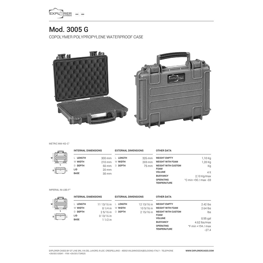 8024482181677 The best protection for your most precious baby - The ultimate weapon case with a variety of functions in the highest quality, manufactured by Explorer Cases in Italy. Specs: Length: 326mm (300mm inside) Width: 269mm (210mm inside) Depth: 75mm (58mm inside) Weight: 1,20kg (1,10kg empty weight without inlay) Color : Black Inlay: Pre-Cube Foam Literally indestructible The weapon cases from Explorer Cases each have corrosion proof metal hinges with lid stay features, which fixate the cover and hold it into place when opened. So you can rest assured that your weapon cases will assist you a long long time. Thanks to the locking latches the weapon cases are always highly secured. The O-ring gasket also makes them water resistant to a great extend. Every weapon case is equipped with a manual air pressure release valve. Therefore you can take it easy and will have no problem handling and closing the case. Exactly how you want it The cases are provided with internal cutouts for optional internal brackets or mounting rings, so you can store everything exactly as it is most suitable for your requirements. Every single suitcase comes with a waterproof removable label with which you can label your equipment or store your data. The case can either be transported traditionally via the large front handle or via optional shoulder straps, which can be easily attached to any model. The 3005 series is optimized for the transportation by airplane.Uudelleen tilattu, toimitusaika n. 4-12 viikkoa Euroopan varastosta.