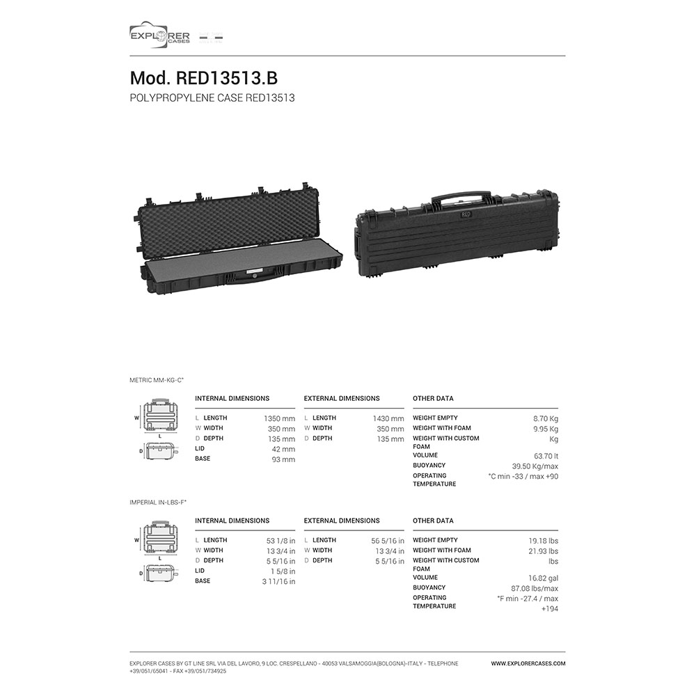 8024482182858 The best protection for your most precious baby - The ultimate weapon case with a variety of functions in the highest quality, manufactured by Explorer Cases in Italy. Specs: Length: 1430mm (1350mm inside) Width: 350mm (350mm inside) Depth: 135mm (135mm inside) Weight: 9,95kg (8,70kg without inlay) Color : Black Inlay: Pre-Cube Foam Literally indestructible The weapon cases from Explorer Cases each have corrosion proof metal hinges with lid stay features, which fixate the cover and hold it into place when opened. So you can rest assured that your weapon cases will assist you a long long time. Thanks to the locking latches the weapon cases are always highly secured. The O-ring gasket also makes them water resistant to a great extend. Every weapon case is equipped with a manual air pressure release valve. Therefore you can take it easy and will have no problem handling and closing the case. Exactly how you want it The cases are provided with internal cutouts for optional internal brackets or mounting rings, so you can store everything exactly as it is most suitable for your requirements. Every single suitcase comes with a waterproof removable label with which you can label your equipment or store your data. The case can either be transported traditionally via the large front handle or via optional shoulder straps, which can be easily attached to any model. The Mod Red 13513 series can also be used as trolley case.Jälkitilaus, valmistajan toimitus myöhässä.