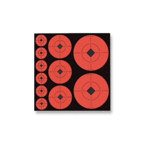 Self-adhesive, fluorescent orange target spots with black diamond center and crosshair lines except for number TS1. High visibility, great for sighting in rifles.