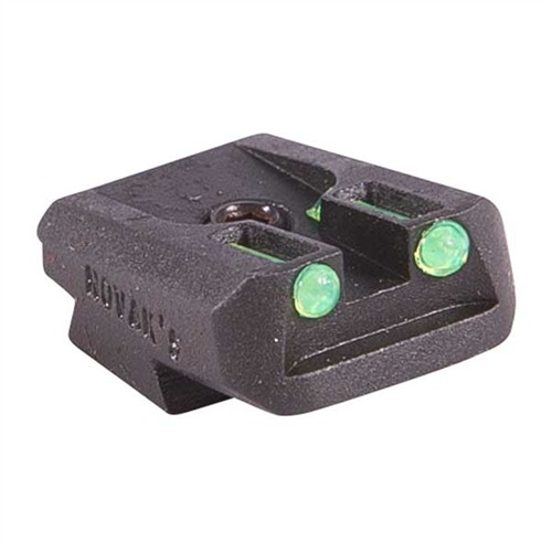Advanced light gathering properties of fiber optic rods make maximum use of ambient light to provide a bright glow that stands out against dark backgrounds and puts you on target fast, even in low-light or high-stress situations. Fronts and rears sold separately, so you can create a custom, three-dot, fiber optic system tailored to your shooting needs. Available with red or green inserts. Lo-Mount rear sights have radiused edges that won’t snag on holster or clothing. Colt rear sight fits Government model; requires milling, installation instructions included.