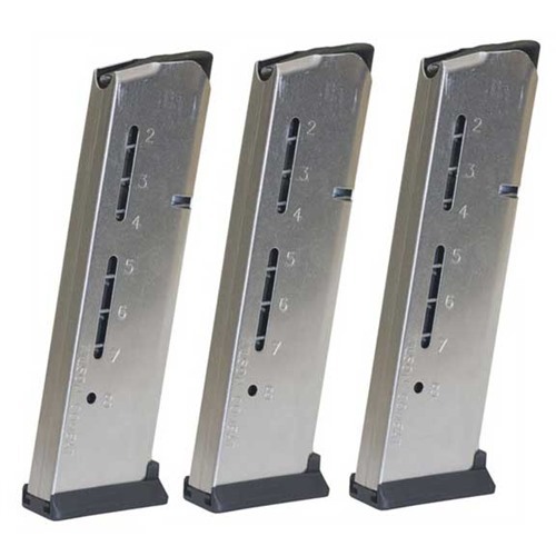 SPECS: 17-7 stainless steel, natural silver or black oxide, finish, with black polymer follower and base pad. Gov’t .45 ACP - 5" (12.7cm) OAL. 8-round capacity.