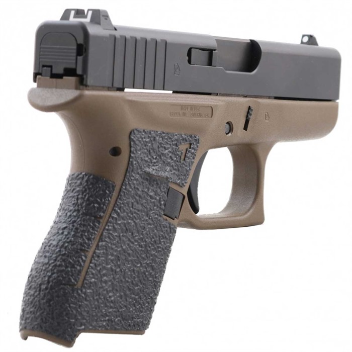 The Glock 42 is a great pocket pistol for personal defense, chambered in the .380 ACP cartridge. However, small pistols like the 42 can be harder to handle, and the Talon Glock 42 Grip Tape ensures that owners of these personal-defense guns can have the solid grip they need. The Talon Glock 42 Grip Tape is designed to adhere securely to any Glock pistol frame, but the tape's adhesive is not permanent and can be removed easily without damaging the gun's frame. Each grip tape option is a full wraparound design and covers the side panels, thumb rest, backstrap and beneath the trigger guard. Available in rubber and granulate finishes Color: black Features all control cutouts The Talon Glock 42 Grip Tape also features cutouts that preserve the "GLOCK" graphic located on the gun's grip frame.
