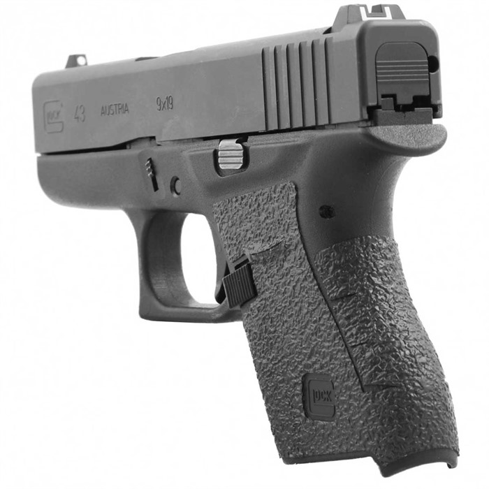 The Glock G43 is a great pistol for concealed carry, thanks to its small size and thin profile. However, these two qualities mean that users aren't able to obtain as solid of a grip on this pistol as they can on full-size guns. The Talon Glock G43 Grip Tape enhances the texture on this pocket pistol. The Talon Glock G43 Grip Tape is a non-permanent addition to your gun that anchors into place, thanks to a solid adhesive. The tape covers both side panels, thumb rests, backstrap and beneath the trigger guard, ensuring that users have all of the principal grip areas enhanced. Comes in rubber and granulate textures Color: black Features cutouts for controls The Talon Glock G43 Grip Tape also features a "GLOCK" graphic, as well as Talon's "T."