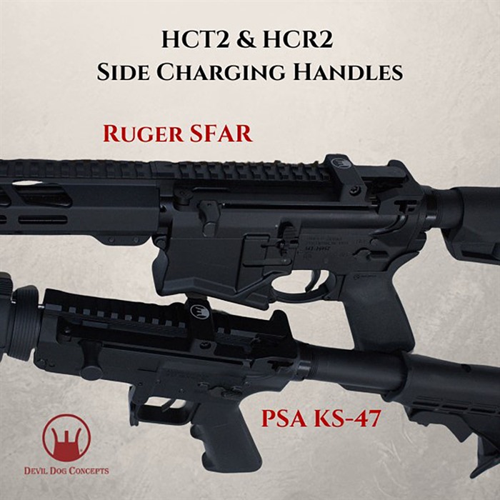 DEVIL DOG CONCEPTS HCR2 G2 HARD CHARGER REAR SIDE CHARGING HANDLE W/TACTICAL PULLING HANDLE FOR AR-15 HCR2 (Hard Charger® Rear – Gen 2) with Tactical Handle: for AR-15 Forged/Billet, SFAR & KS-47 No longer do you have to rebuild your upper receiver or buy a new rifle to have the side charging capability!! Turn your rifle in to a Side Charger without having to rebuild or modify it. Simply swap out the charging handle and install the Hard Charger. Takes a minute or less and you are up and running! FEATURES Devil Dog Concepts’ Side Charging Handle System = Ergonomically Beneficial Multiple Ways to Charge Interchangeable from Rifle to Rifle Non Reciprocating Removes Stress on Roll Pin Reduces Torque on Charging Handle Field Strippable – Gross Motor Skills Plenty of Room for Mounting Optics and Sights The HCR2 (Hard Charger® Rear Gen 2) Mounts to the 1st Picatinny Rail. This new model is designed to work on Standard, Forged, Mil-Spec Type Upper Receivers & Billet Rifles. Will also work on Ruger SFAR & PSA KS-47 This design mounts to the first slot allowing for scope base mount in front. The adjustable tip allows for mounting on varying width Billet Receivers as well as the Ruger SFAR and PSA KS-47. Not designed for Aero M4E1 SPECS For Forged & Billet AR-15s, and also Ruger SFAR & PSA KS-47 Made from 7075 Aluminum Anodized Black, and Steel Weighs 6oz