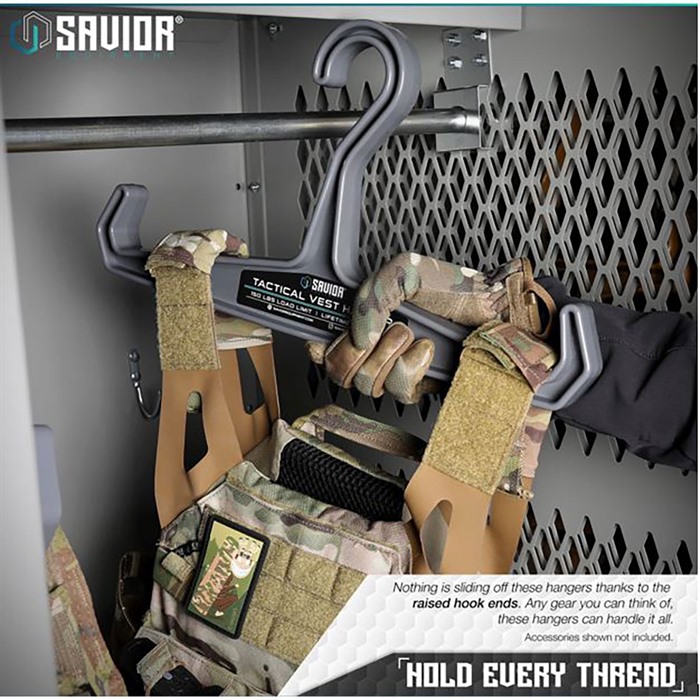 HEAVY DUTY VEST HANGERS, VEST HANGER HEAVY DUTY GRAY -brändiltä SAVIOR EQUIPMENT on täydellinen ratkaisu taktisten liivien ja levyliivien säilyttämiseen. Nämä henkareet on suunniteltu kestämään jopa 150 lb (noin 68 kg) kuormaa, joten voit luottaa niiden laatuun.