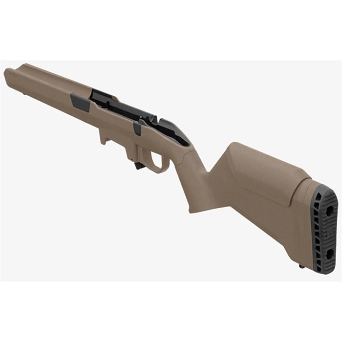 MAGPUL® HUNTER LITE ADJUSTABLE STOCK FOR RUGER AMERICAN® The Hunter Lite – Ruger American Short Action is a purpose-built hunting stock that is designed for Ruger American and Ruger American Gen II rifles chambered in short-action calibers. The Hunter Lite streamlines the design of our original Hunter Stocks, reducing the weight and size to provide a fully featured upgrade for those wanting a hunting rifle that won’t weigh them down during extended outdoor pursuits. The result is a stock that weighs approx. 2 lbs., 6 oz. or almost 25% less than the Hunter American Stock, with a forend that’s almost 25% narrower than the original. Featuring enhanced ergonomics, the Hunter Lite Stock – Ruger American Short Action is compatible with both right and left-hand rifles by simply swapping out an inlet insert on the stock. Other key features of the Hunter Lite include an aluminum V-bedding block featuring reinforced steel pillars to prevent compression and deformation while shooting. The buttstock and forend also have integral sling swivel studs for use with a variety of slings and bipods, and removable half-inch spacers for LOP adjustment and snap-on cheek risers for adjustable comb height. The enlarged trigger guard allows comfortable use with gloves and easy access to the ambidextrous magazine release. The forend of the Hunter Lite is compatible with barrel profiles up to Medium Palma and it includes multiple M-LOK slots accommodate your choice of M-LOK accessories. Made in the USA. FEATURES EXTRUDED ALUMINUM V-BEDDING BLOCK Reinforced steel action screw pillars provide extra rigidity, prevent stock compression and deformation while shooting Right and left-hand configurable by the end user by swapping out inlet insert Accommodates barrel profiles up to Medium Palma AICS-COMPATIBLE MAGAZINE WELL Ambidextrous magazine release paddle Enlarged trigger guard for use with gloves Magazines sold separately ADJUSTABLE AND VERSATILE Four (4) removable 1/2" buttstock spacers for adjustable LOP, 13”-15” Snap-on 3/8"" cheek riser for adjustable comb height Sling swivel studs on buttstock and forend M-LOK slots on forend SPECS Platform: Ruger American® Butt-Pad Dimensions: 1.5 x 4.9 in. Cheek Height Adjustment Range: 3/8 in. via included Riser Length of Pull: 13-15 in. LOP using included Spacers Weight: 2.6 lbs w/ two Spacers Width of Stock, max: 1.75 in. COMPATIBILITY Compatible with Ruger American Rifle & Ruger American Rifle Generation II right-hand & left-hand models chambered in short action calibers. NOT compatible with rifle models equipped with an AR-magazine capable stock from the factory. Accepts all factory Ruger barrels as well as aftermarket barrel profiles up to a Medium Palma (0.920"" dia. 5.50"" forward of the breech). Accepts most factory and aftermarket triggers.