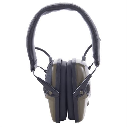 The Howard Leigh Impact Sport Electronic Earmuffs offer compact, lightweight electronic hearing protection allowing you to hear conversations and range commands, while blocking out dangerous noises like gunfire. Internal ultra-fast response electronics amplify ambient sounds to a safe 82 decibels (dB), yet shut down when sounds above 82 dB are detected to let the muff’s passive hearing protection take over. When the earmuffs are in amplification mode, directionally placed stereo microphones even help you hear where the sound is coming from. Built-in AUX input accepts 1/8" (3mm) stereo plug (patch cable included) to connect an MP3 player, radio, or other audio. The Impact Sport Electronic Earmuffs feature an automatically shut-off that activates after 4 hours to preserve battery life. Bottom half of the low-profile ear cups angles in sharply to ensure plenty of clearance when shouldering long guns. Cups fold up neatly into the adjustable head band for convenient storage.